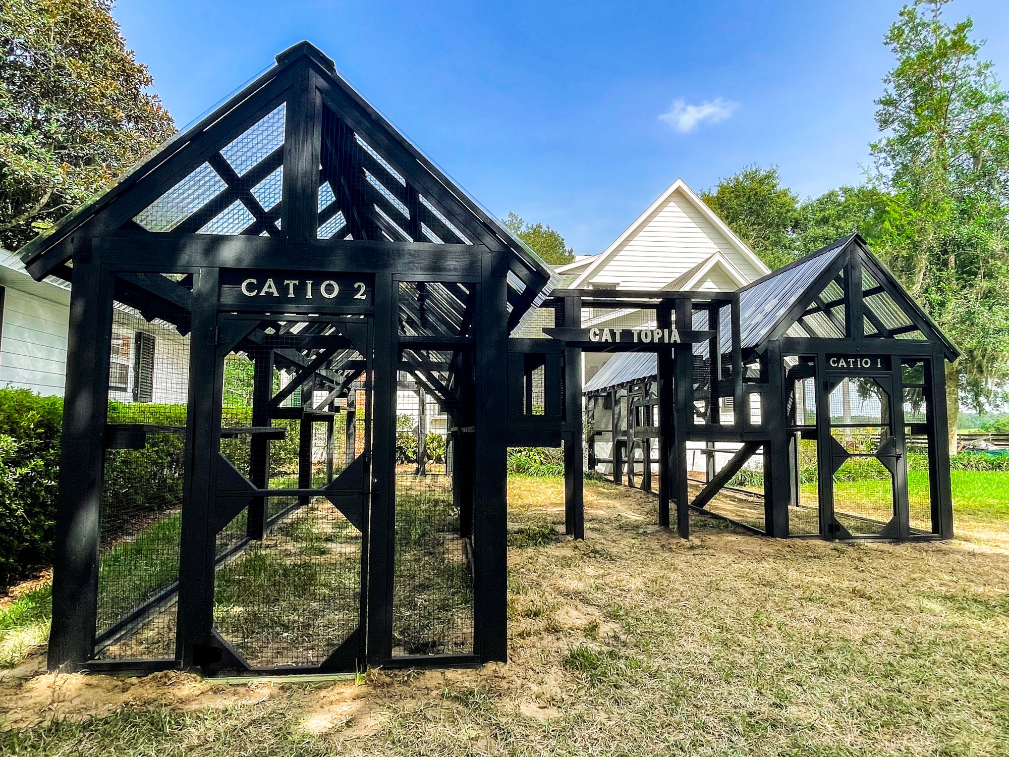 Situated in Brooksville, Florida, this 450-square-foot painted catio includes two enclosures topped with gable-style roofs and a 40-foot connecting tunnel. Constructed with pressure-treated wood, it provides a safe and attractive area for cats to roam and enjoy.