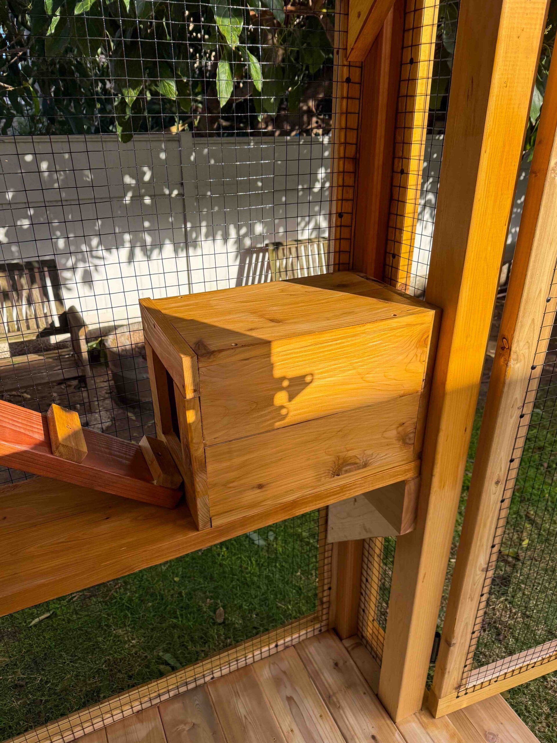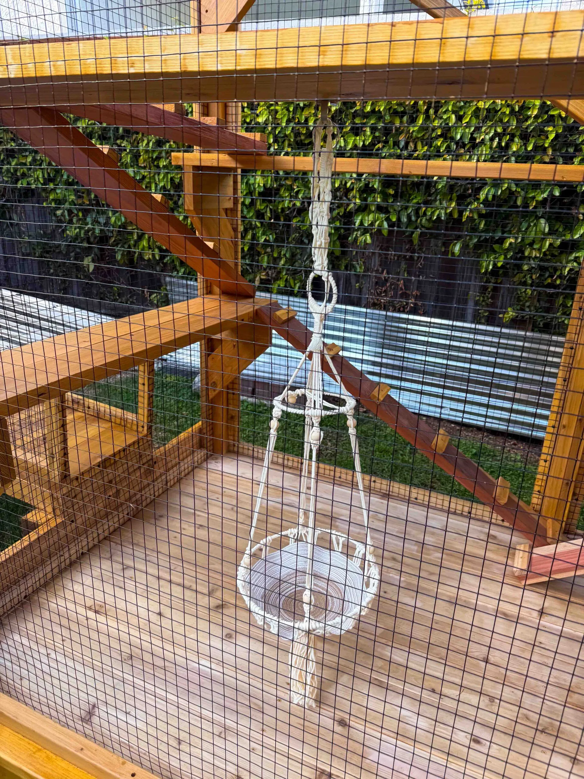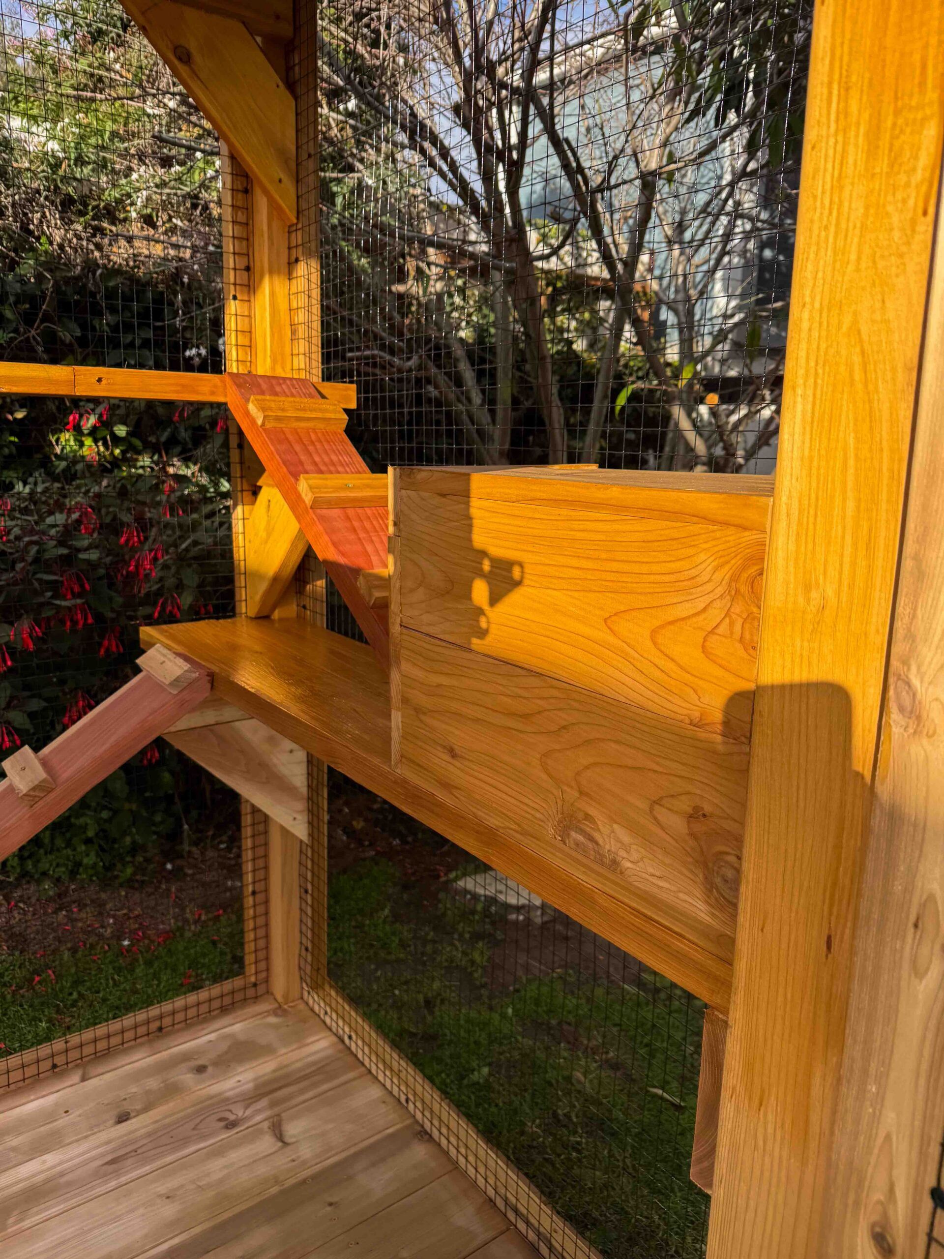 From the home, a 12-foot enclosed tunnel creates a safe, elevated pathway leading directly into the freestanding catio. Because the tunnel has no roof, it maintains an open and airy feel while still providing fully enclosed protection along the sides.