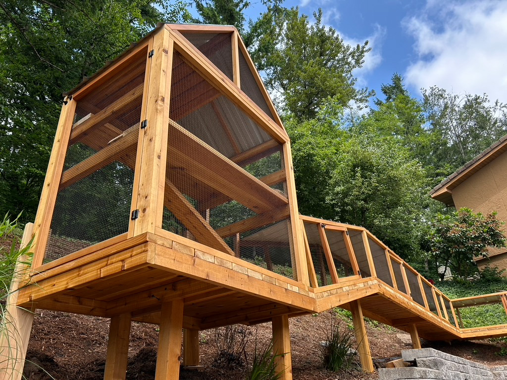 This custom wrap-around catio measures 9 feet wide, 4 feet deep, and 8 feet tall. Built with richly aromatic cedar, it’s painted to match our clients home. As a result, it adds beauty to their yard while delighting your cat.