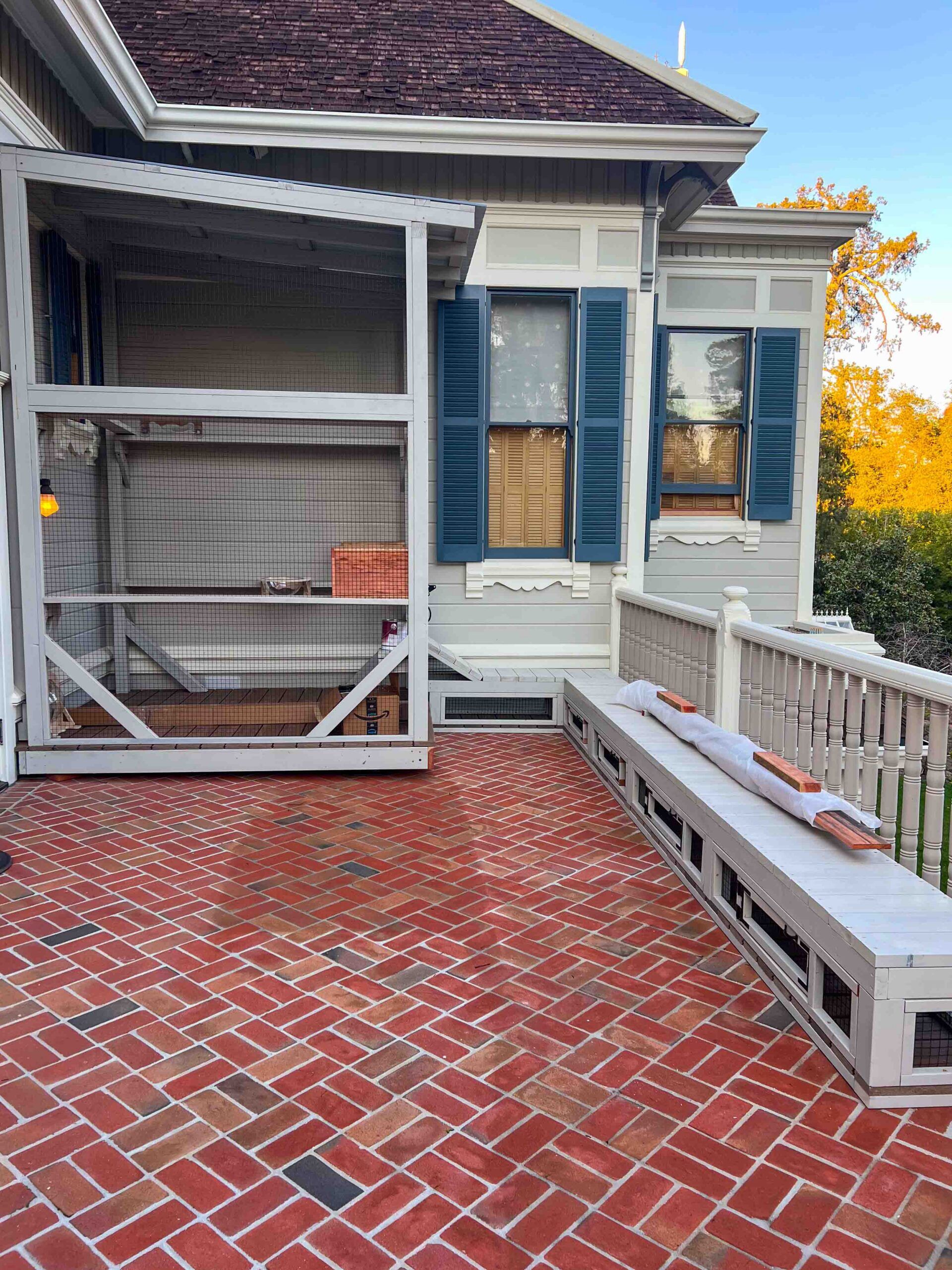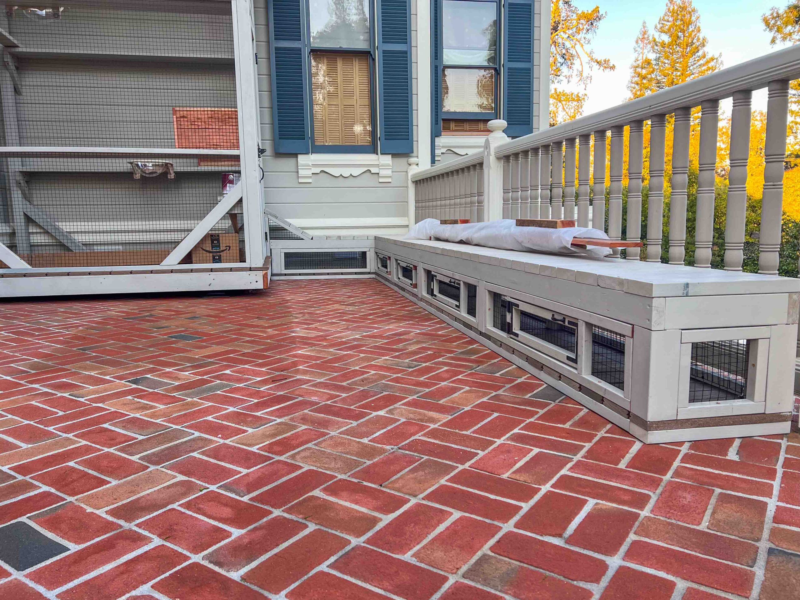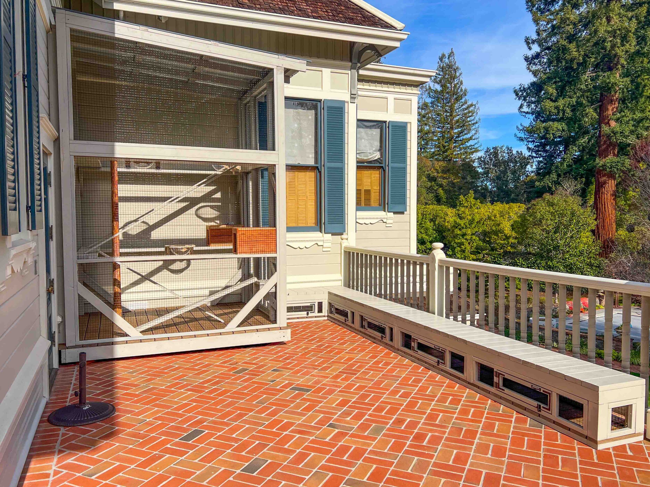 An enclosed 20-foot tunnel extends along the balcony floor beneath the railing, connecting spaces and encouraging exploration. This elevated build is supported by a custom platform with composite decking, ensuring durability, comfort, and a polished finish. A dedicated window inside the catio provides secure cat access, while the structure stops cleanly at the second window’s shutter for a precise, intentional fit.