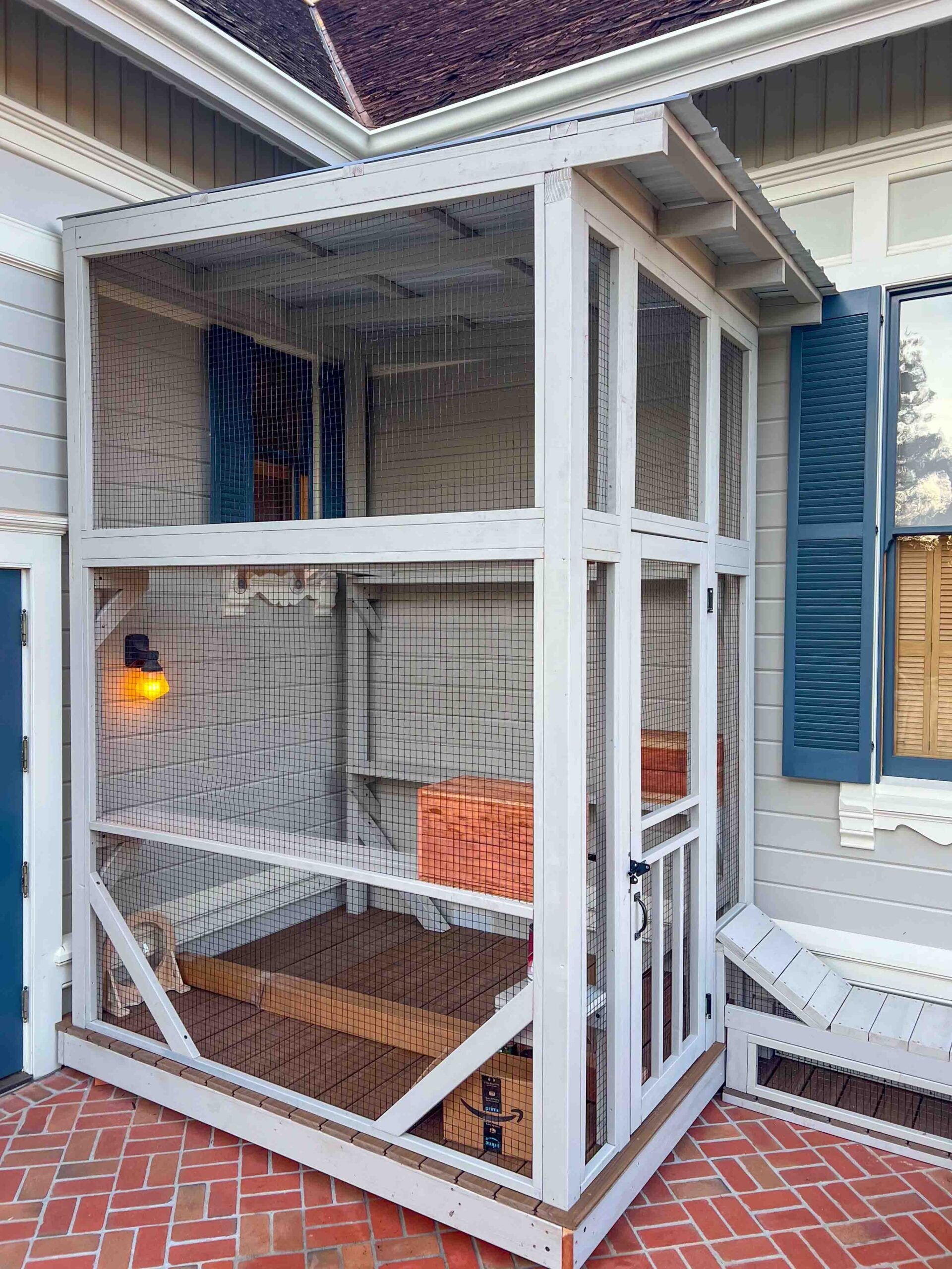 This striking custom catio is built into the corner of a second-story balcony, creating a vertical playground that maximizes both height and movement. The main catio measures 8 feet deep, 7 feet wide, and 10 feet tall, offering ample room for climbing, lounging, and observing the world from above. The structure drops below the window and narrows at that point, creating visual interest while adapting seamlessly to the home’s architecture.