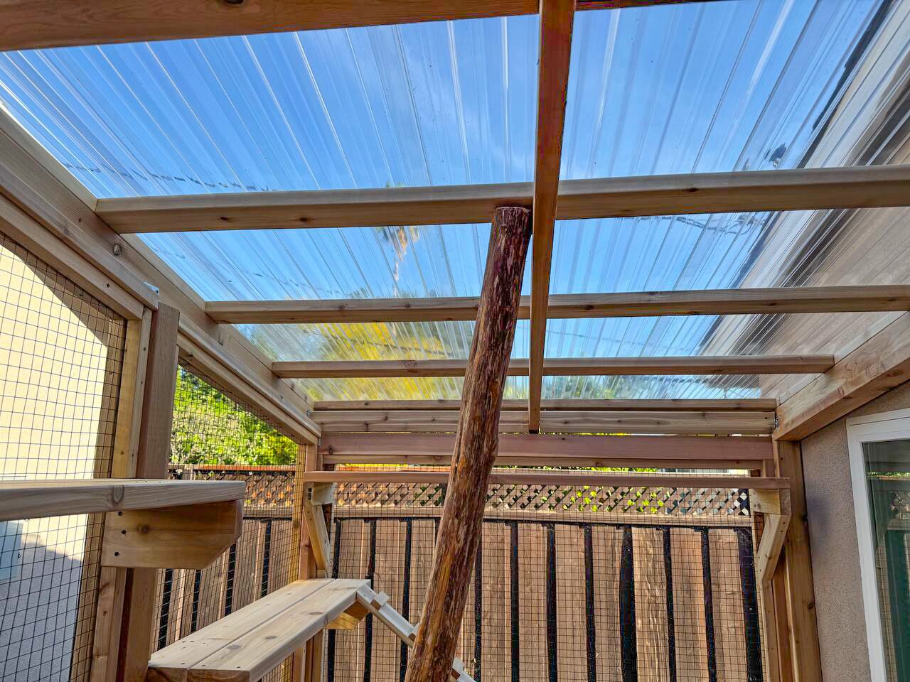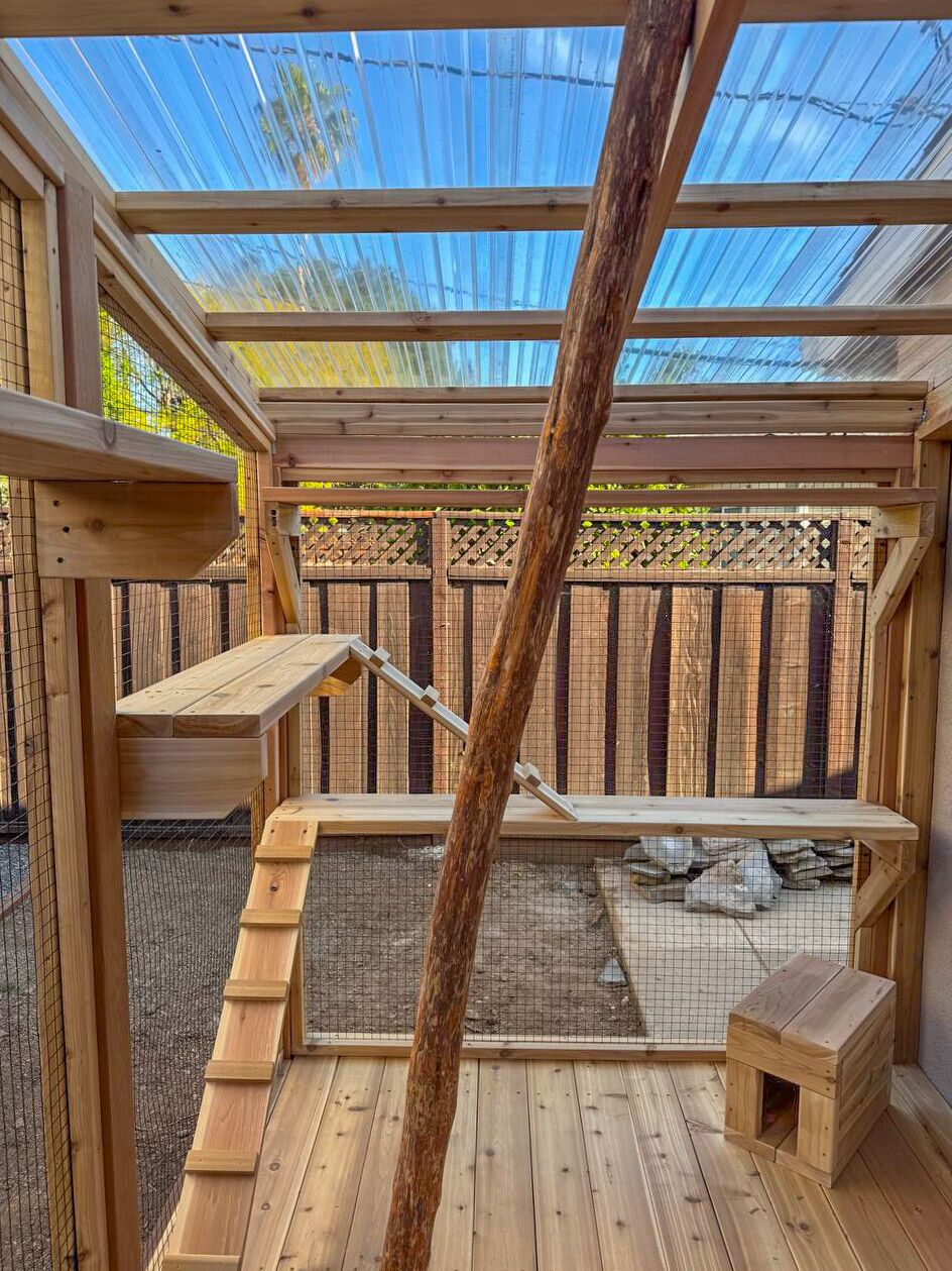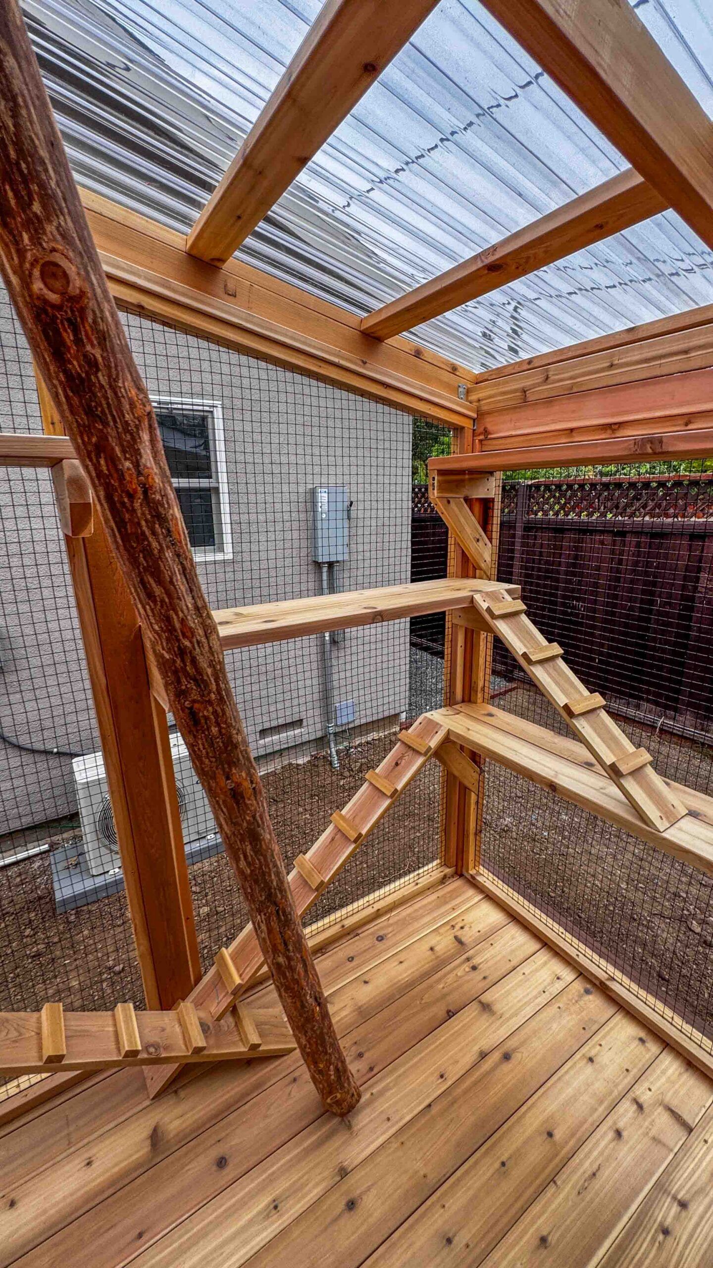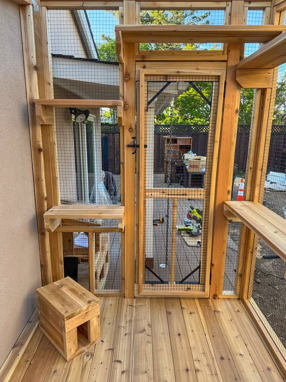 Inside, the space is designed for both activity and comfort. Shelves and ramps provide easy movement between levels, supported by a floor-to-ceiling cedar scratching post and two cozy cedar cat cubbies for rest. A custom-built tunnel, 2 feet wide and extending from a wall-installed cat door connects the home directly to the enclosure, gradually rising in height as it enters the catio and featuring a built-in bench top for added functionality. The result is a dynamic, enriching outdoor space that gives cats the freedom to explore while staying completely safe and connected to home.