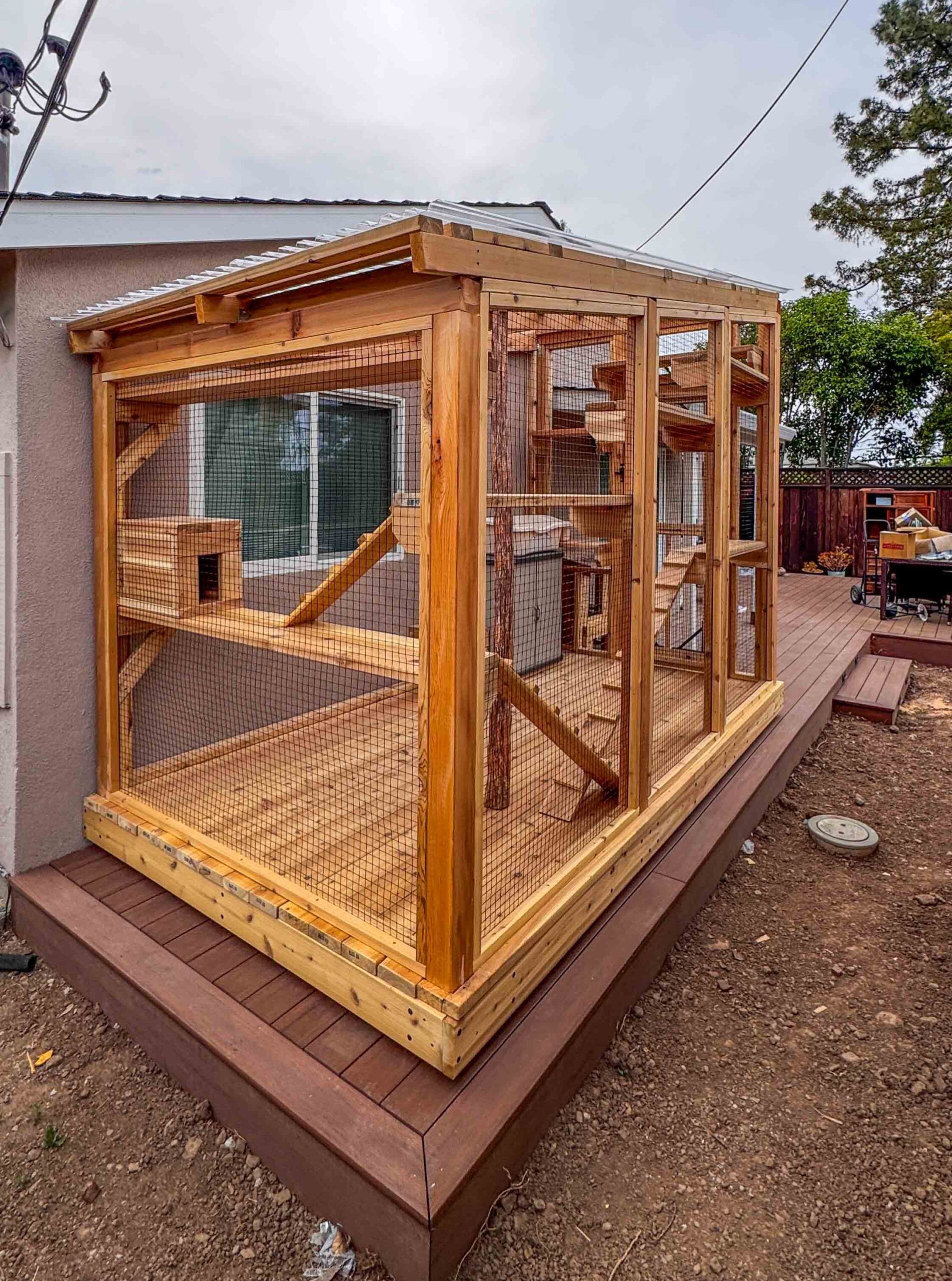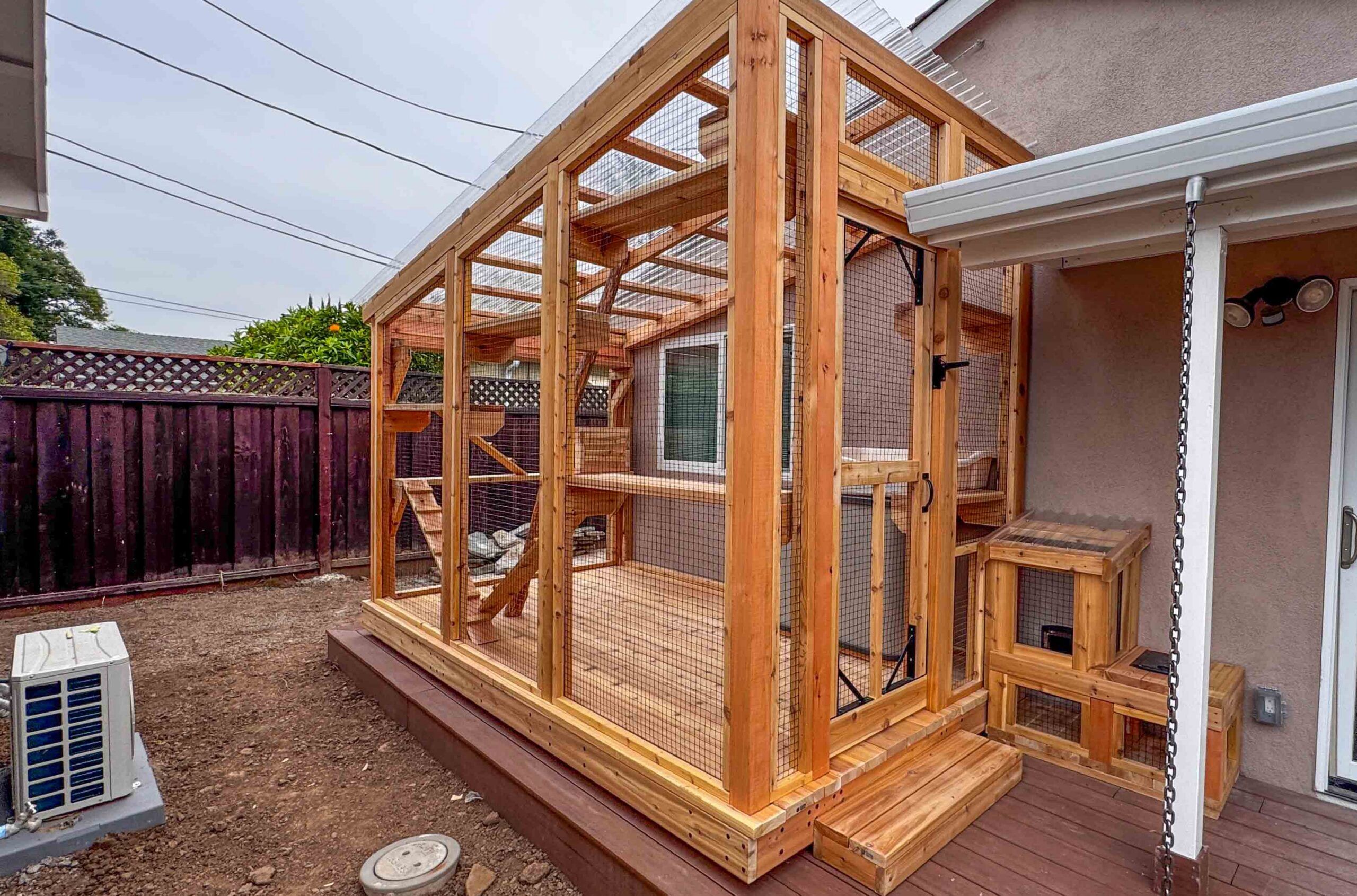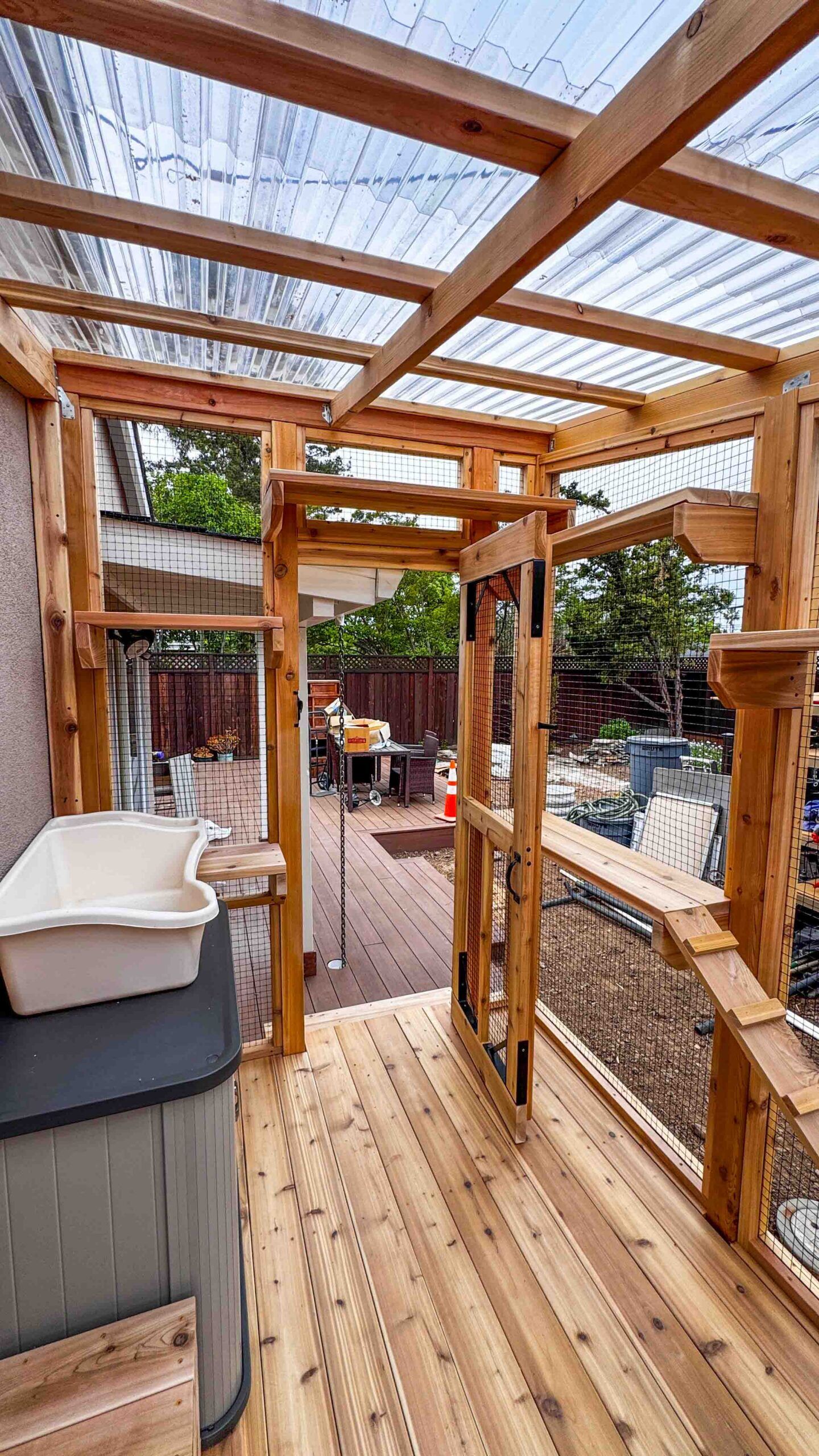 Inside, the space is designed for both activity and comfort. Shelves and ramps provide easy movement between levels, supported by a floor-to-ceiling cedar scratching post and two cozy cedar cat cubbies for rest. A custom-built tunnel, 2 feet wide and extending from a wall-installed cat door connects the home directly to the enclosure, gradually rising in height as it enters the catio and featuring a built-in bench top for added functionality. The result is a dynamic, enriching outdoor space that gives cats the freedom to explore while staying completely safe and connected to home.