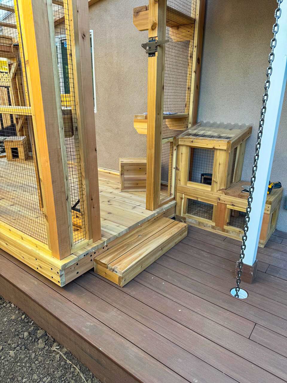 Measuring 12 feet wide, 6.5 feet deep, and 10 feet tall, this enclosure offers a generous footprint that balances openness with structure. Built from cedar lumber and finished in a rich walnut stain, it delivers long-lasting durability with a warm, elevated aesthetic. The roof is carefully sloped to mirror the home’s existing pitch, creating a seamless visual flow, while 1” x 1” black PVC-coated welded wire fencing ensures safety without compromising visibility. Although constructed on top of the existing deck, the design maintains a freestanding feel for flexibility and stability.