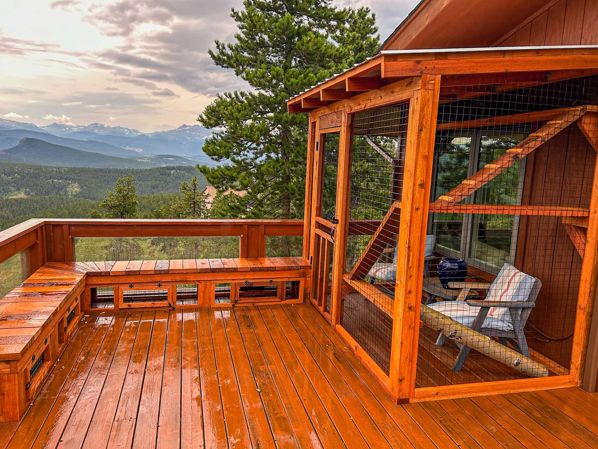 We build the entire structure from rich cedar lumber and stain it to match your existing deck. This gives the catio a polished, cohesive look. A sleek metal roof provides durable, year-round protection from the elements. Inside, your cat can explore tiered shelves and ramps, creating an environment that encourages climbing, perching, and play.