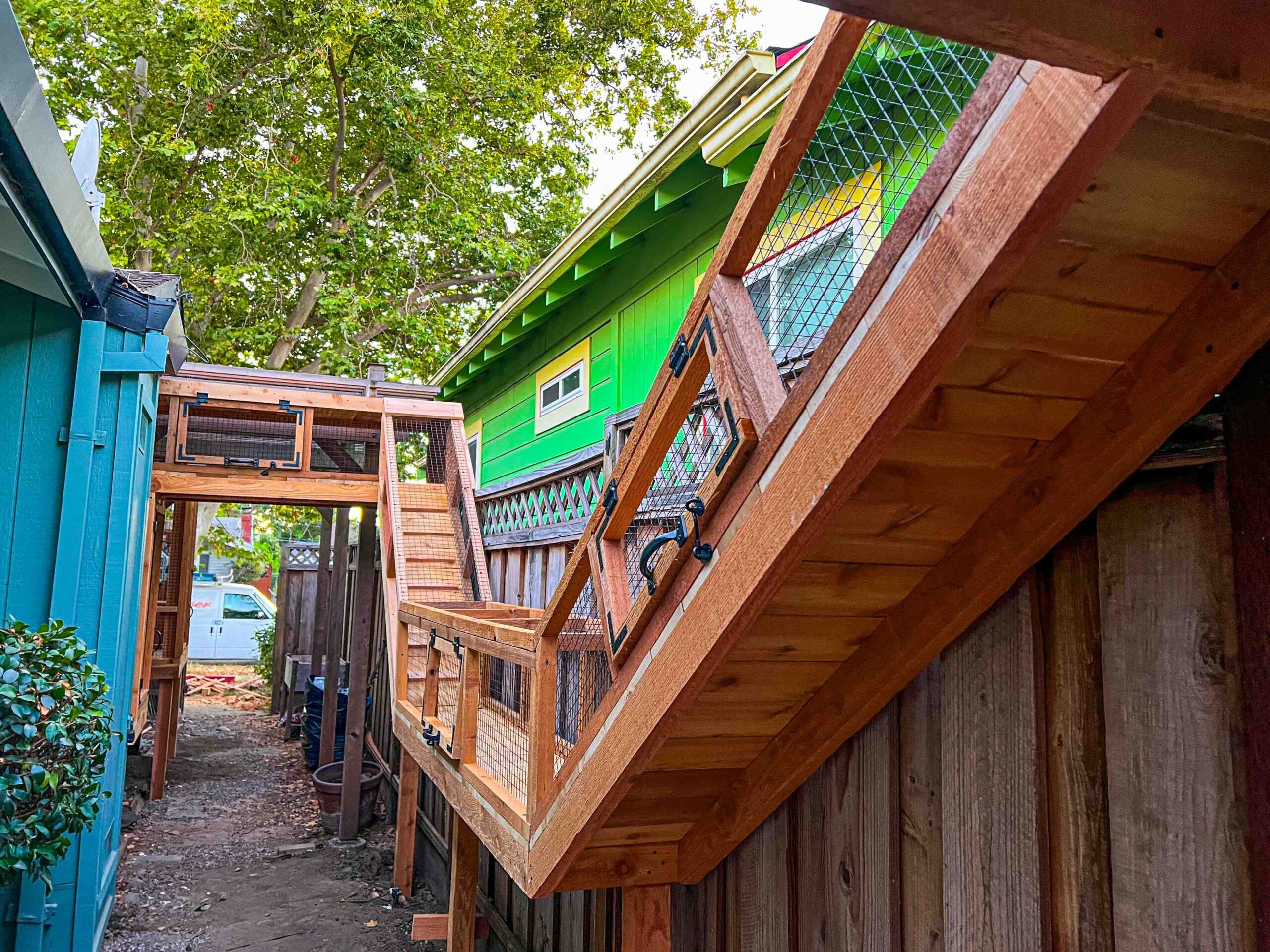 Crafted from durable cedar lumber, secured with 1” x 1” black PVC-coated critterfencing, and topped with clear polycarbonate roofing, The Whisker Way ensures strength, weather protection, and wide-open views. Each catio includes bug screening, shelves, and ramps to encourage climbing, playing, and lounging at different levels.