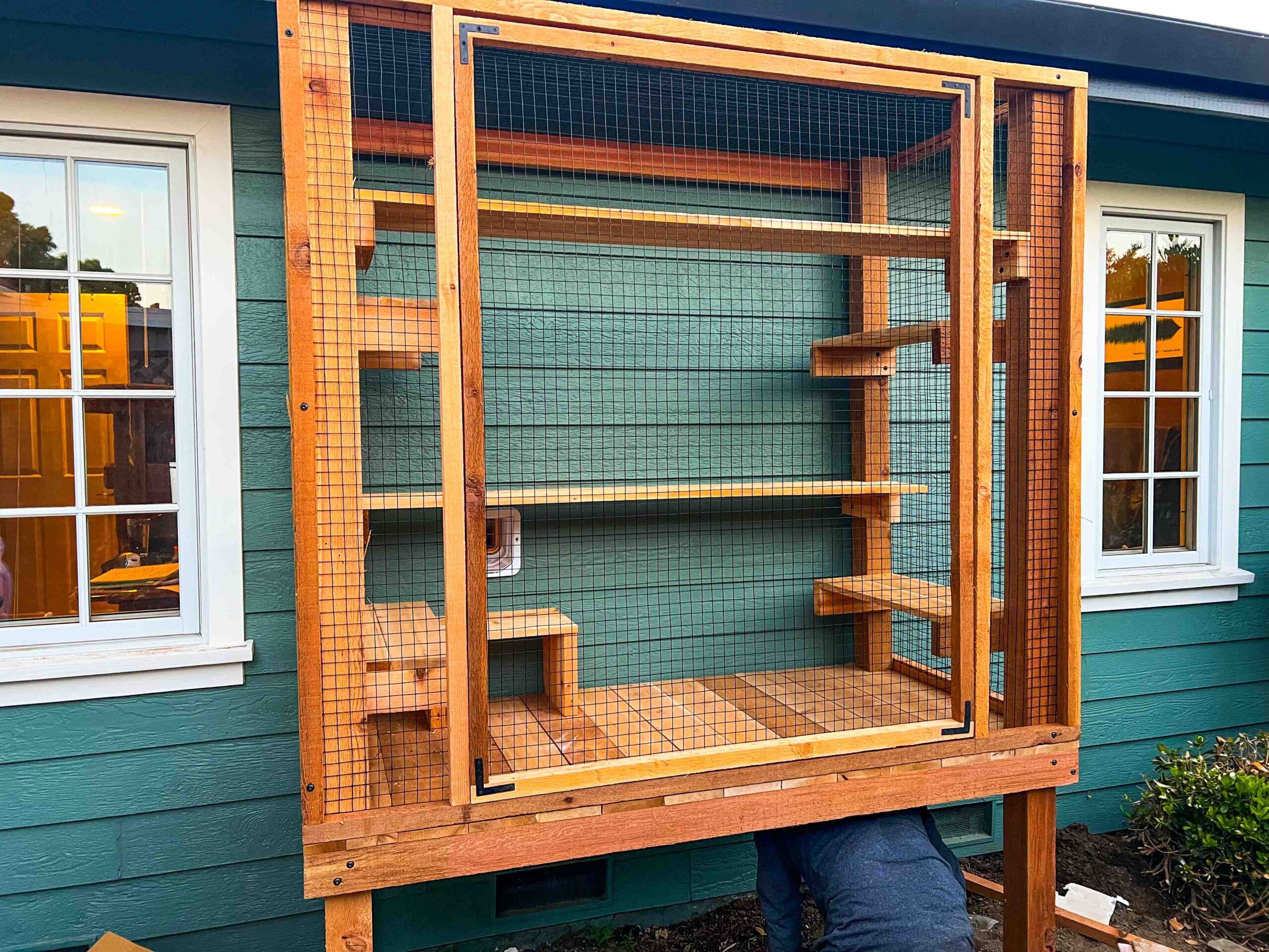 - Catio 1 — 2 ft deep x 5 ft wide x up to 8 ft tall, with wood wall around the bottom 2 ft for added privacy