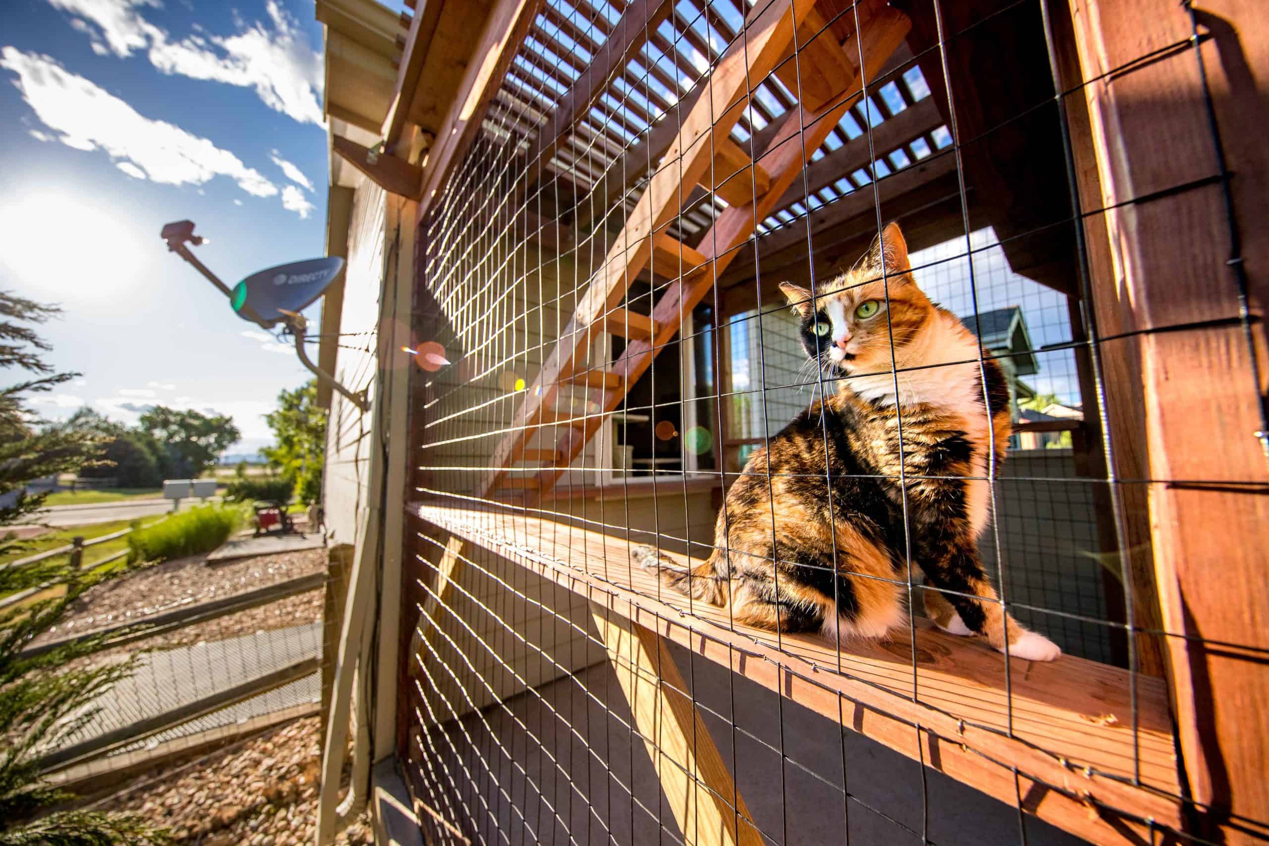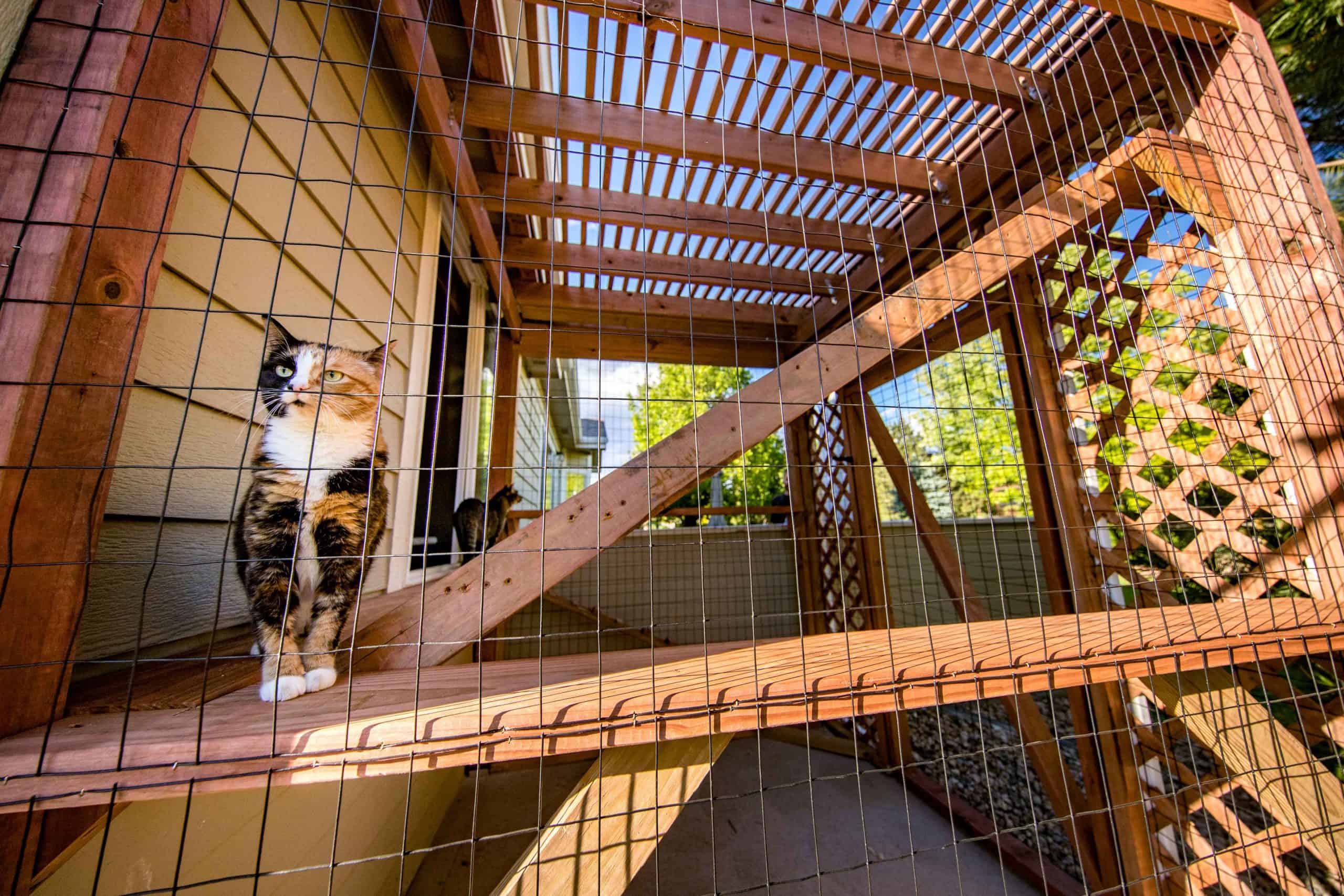 This outdoor cat enclosure can fit multiple cats comfortably. There are multiple levels and perches for each cat to have their own space to enjoy the outdoors. The cat fencing is strong enough to keep any predators from entering the outdoor cat house. Cat safety is out top priority. That’s why we make sure they our catios are build right, and built to last.