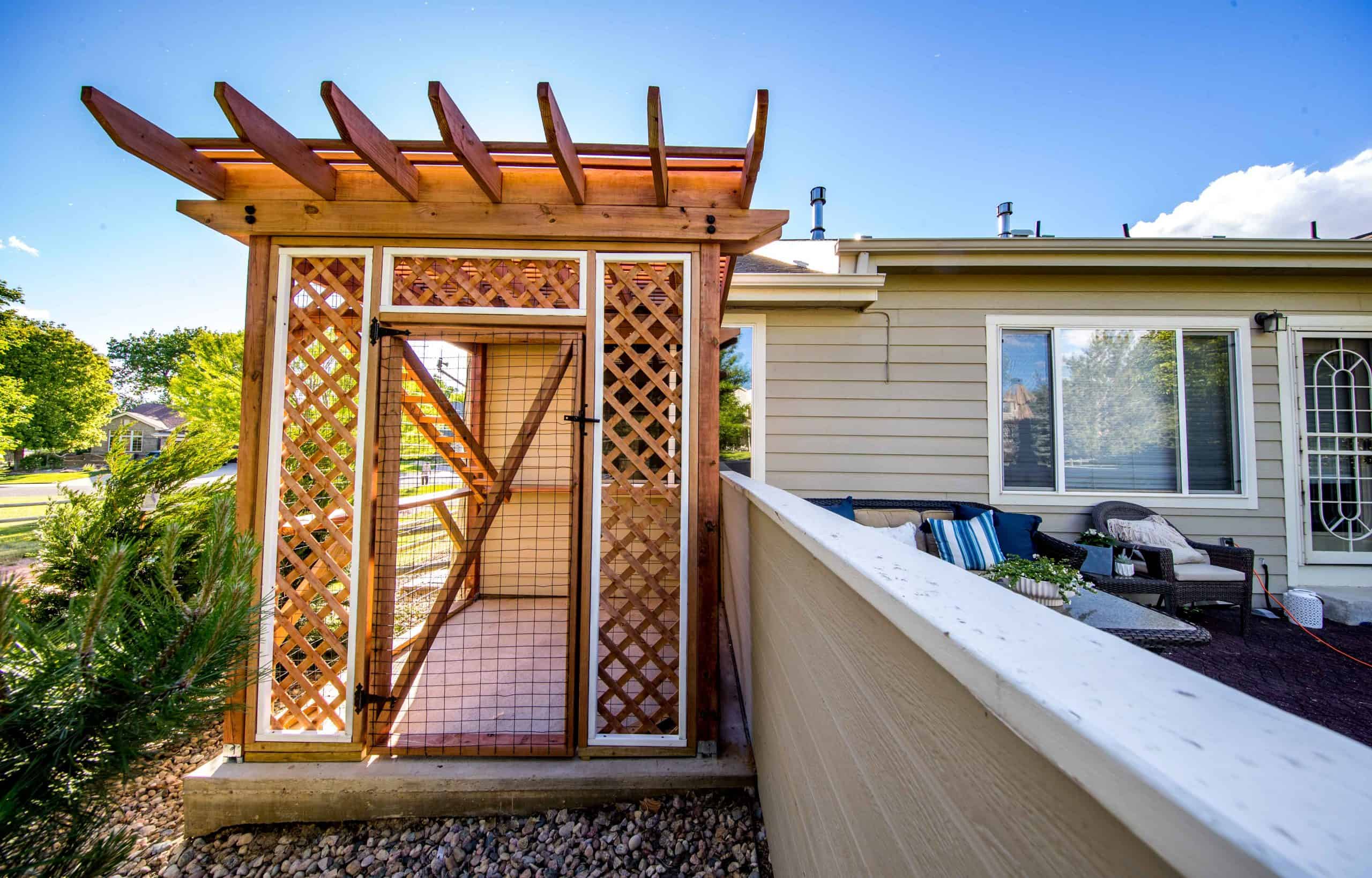 The Purrgola catio is the purrfect waterproof outdoor cat house. This catio is clean and looks great as an addition to your backyard landscape. Browse through the Purrgola photos and order one today! If you are unsure about sizing, contact us and schedule a free site visit!
