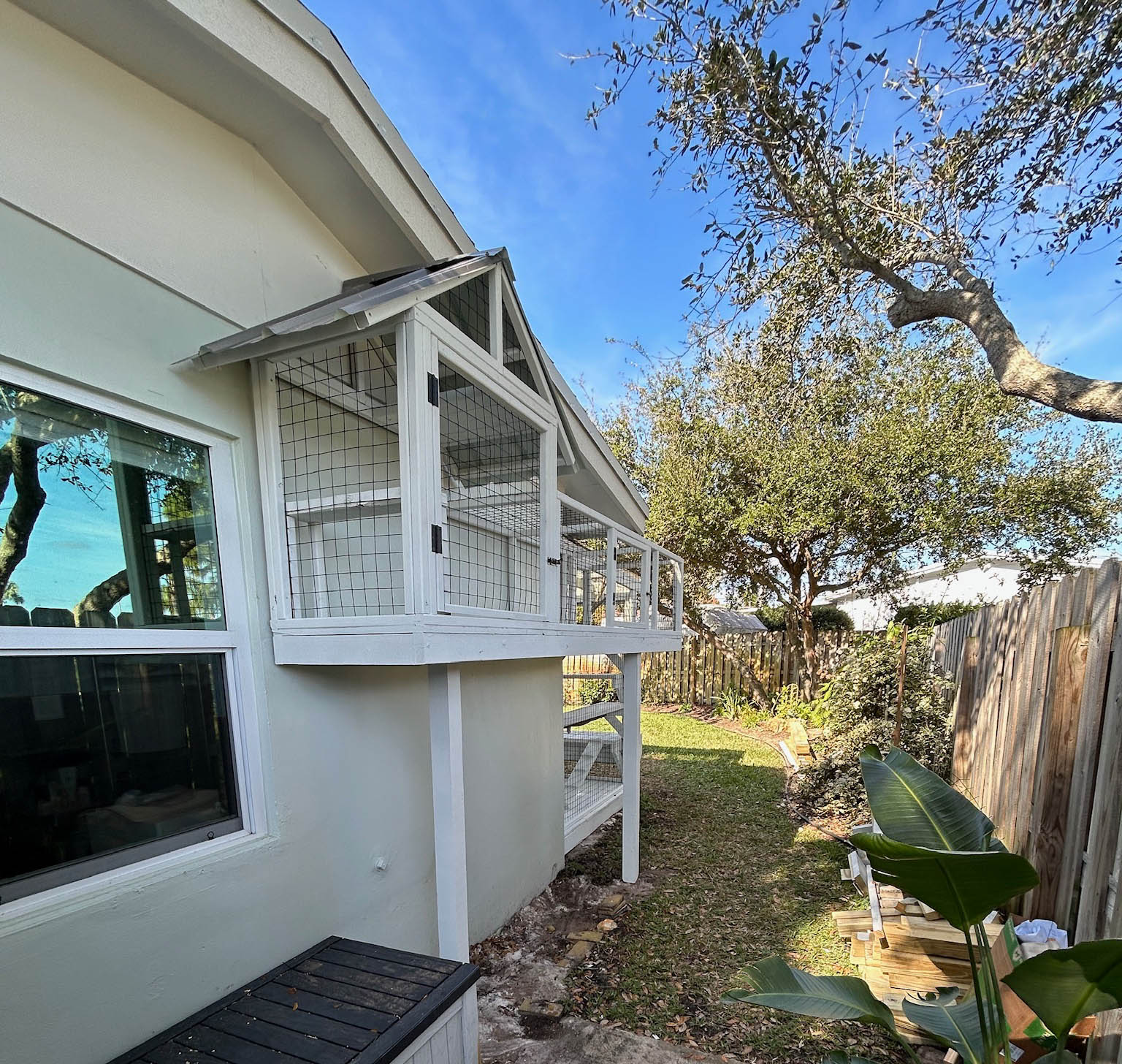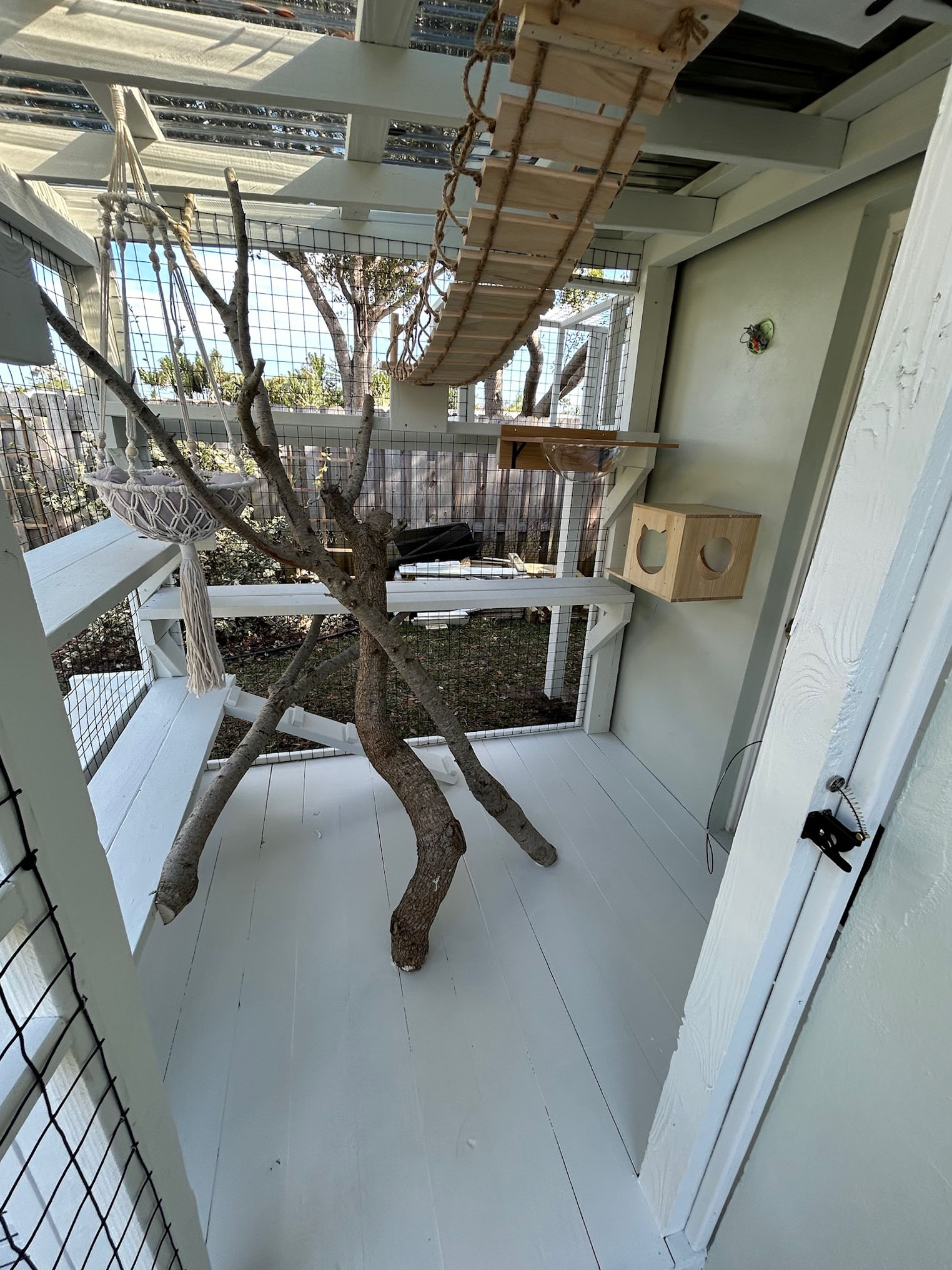 A sleek clear polycarbonate roof offers full rain protection without sacrificing sunlight, and black PVC-coated 2″ x 2″ fencing provides predator-proof security while maintaining an elegant look. A full-sized human door — complete with an integrated cat door — makes access convenient for both you and your feline companion.